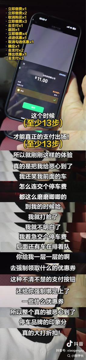 - 不少網(wǎng)友吐槽,自己在掃碼繳納停車費時體驗感不佳,明明輸入車牌號就可以付錢的小程序,卻還要和隨時彈出的廣告和所謂的“優(yōu)惠活動”斗智斗勇。網(wǎng)友A就曾有過這樣的經(jīng)歷:掃碼跳轉至繳費頁面,在“立即繳費x元”的下方,有一個白色框寫有“領取5元券本次停車可用”的字樣,點擊“確認”后,竟自動跳轉至廣告鏈接,上面提示,車主需要綁定支付寶并開通自動包月服務,才可領取到5元的停車抵用券。這樣一頓操作下來,全程下來需要花費大約5分鐘,且還不一定能成功領取抵用券。而網(wǎng)友B則是遇到過直接誘導消費的問題,停車兩小時,花費8元,但在繳費時出現(xiàn)了某某TV廣告鏈接,點進去后被扣了5元錢,工作人員告知費用是由第三方支付平臺扣除的,網(wǎng)友B只好吃了啞巴虧。類似以上這樣額外捆綁的行為頻頻發(fā)生,給用戶帶來了不必要的干擾和困擾。